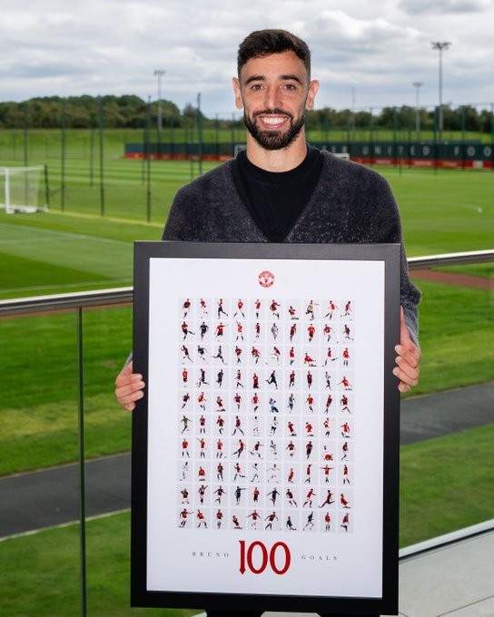 9月25日讯 曼联足球总监贾森-威尔科克斯向B费赠送了一件装裱好的艺术品,以纪念他为曼联打入的第100粒进球。B费在卡灵顿训练基地的餐厅里,在队友和工作人员面前领取了这份礼物。